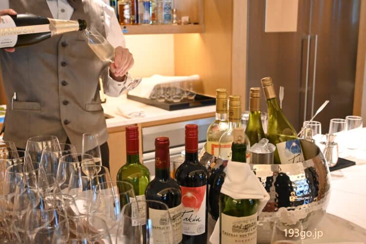 17:30のカクテルタイムになると、スパークリングワインやワイン、またもう1つの冷蔵庫にはギネスや一番搾りなどが揃う。また、ホテルスタッフから各種アルコールが提供される。
