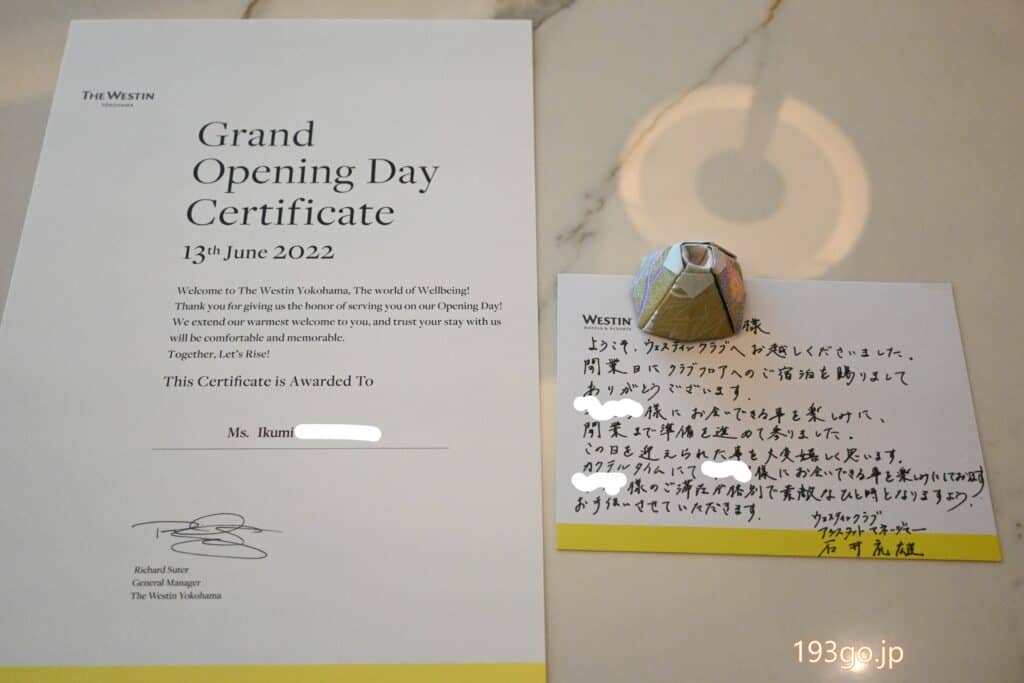 チェクインの際に、「本日の記念」にと「Grand Opening Day Certificate」(グランドオープン日の証明書)を頂きました!特別感があって嬉しい!