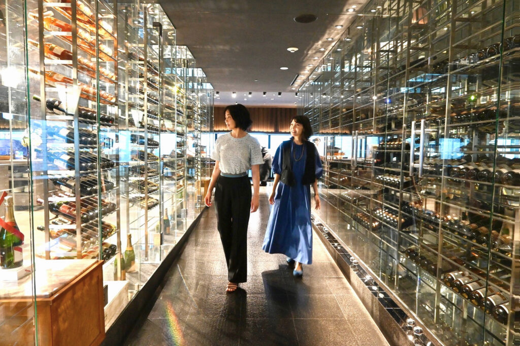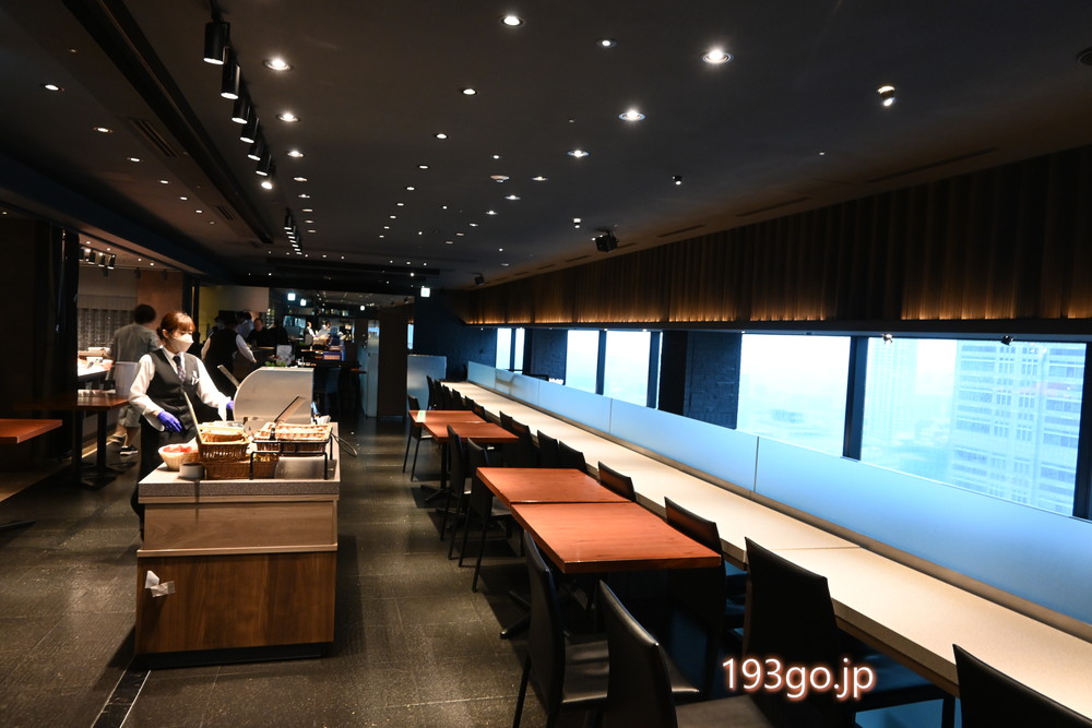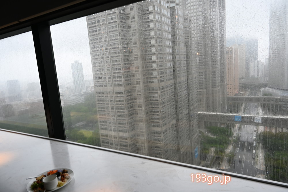 エレベーターを降りレストランのエントランスに向かうと、床から天井までのキラキラなワインセラー! その先には新宿・高層階ならではの迫力のビュー!となるはずが…、この日はあいにくのお天気。パッと晴れた日は気持ち良い朝を迎えられそう。