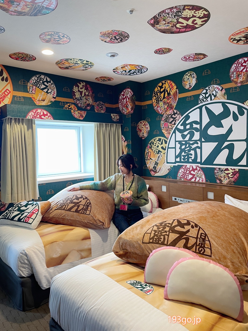 「どん兵衛」の「麺」をデザインしたベッドライナーに、「おあげ」や「かまぼこ」をかたどったクッション、「どん兵衛」のパッケージを所せましとデザインした壁紙など、まさに“どん兵衛まみれ”の部屋で癒しのひとときを、翌朝は朝食ビュッフェで“朝どん兵衛”も堪能。