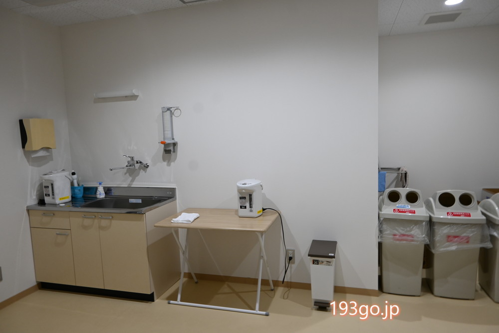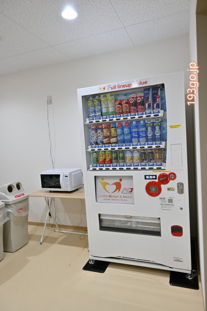 共用のトイレとシャワー室、洗面台、台所にポットと電子レンジ、自販機も。
