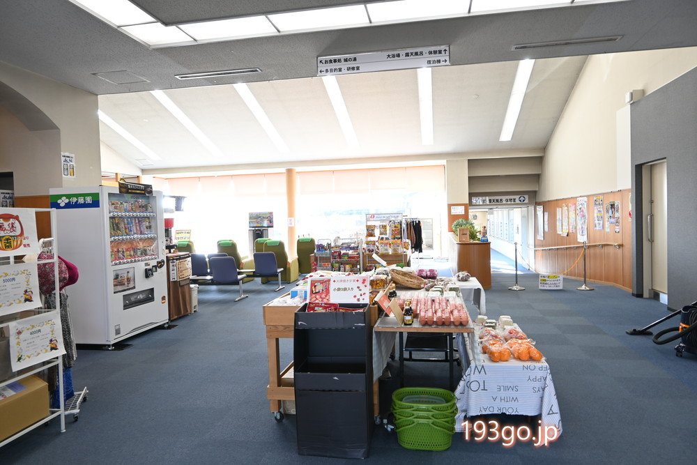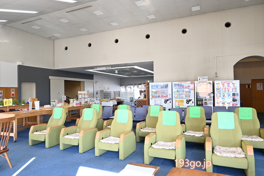温泉棟にはリクライニングチェアが並んだ休憩スペースと売店、食事処。