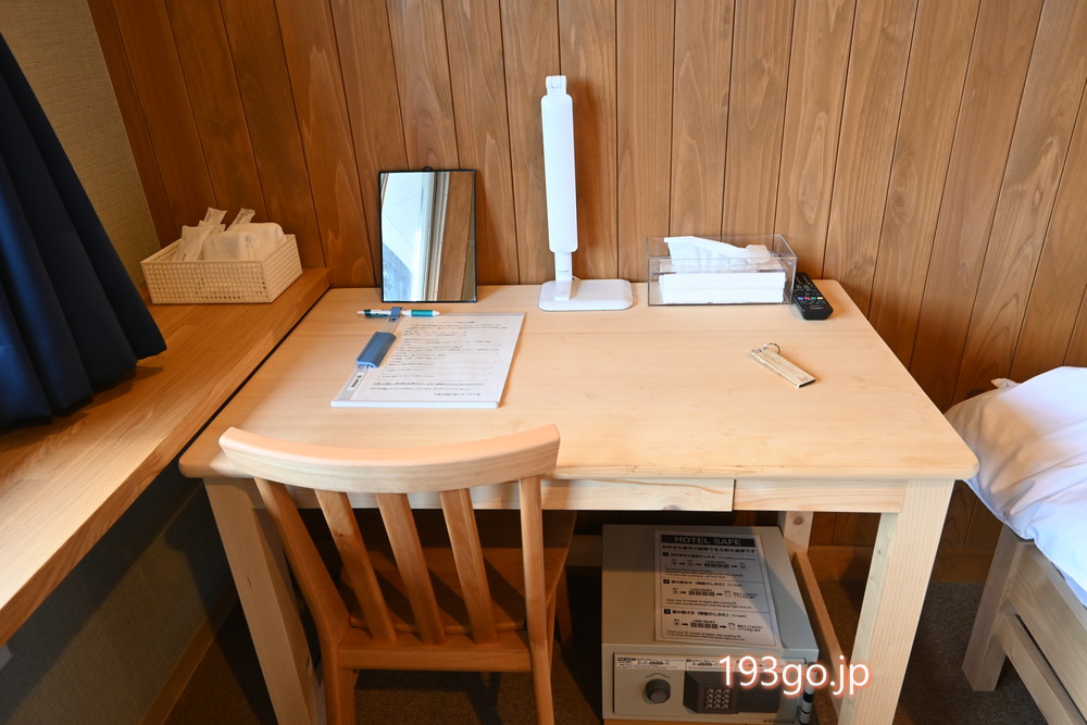 窓側にデスクとセーフティーボックス、ミニ冷蔵庫。スタンドライトとミラー、タオルと歯ブラシなどのアメニティが用意されている。