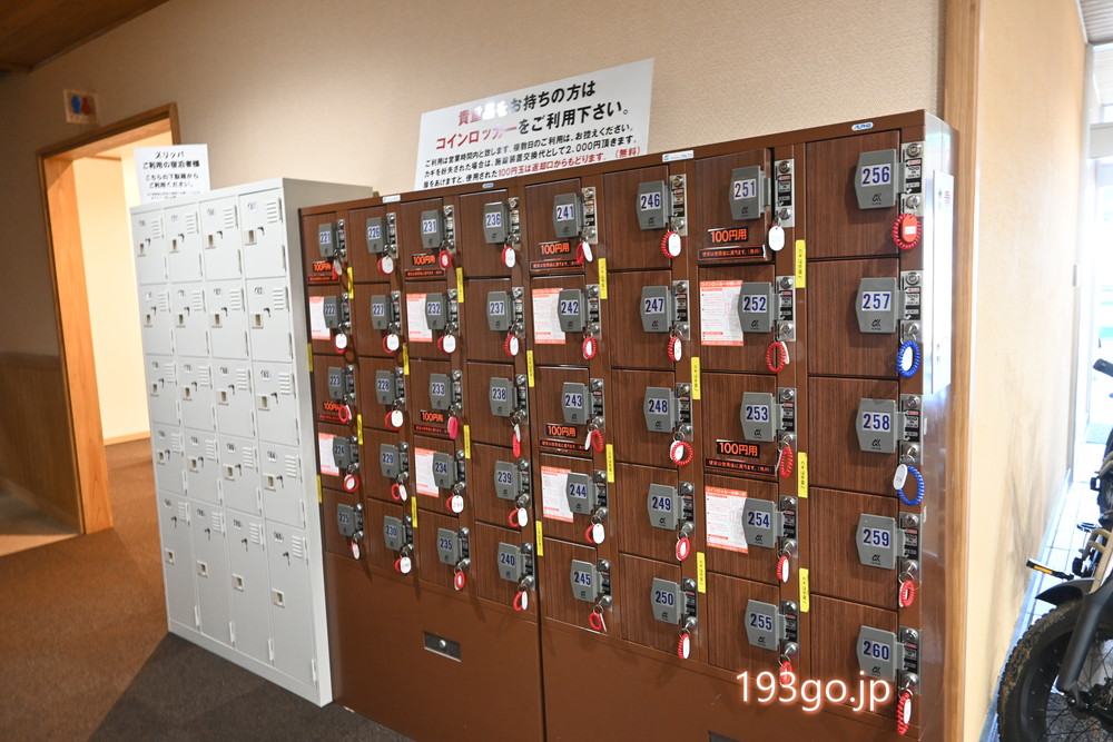 浴室に鍵付きロッカー(100円返却式)、冷水器、洗面台、ドライヤー。