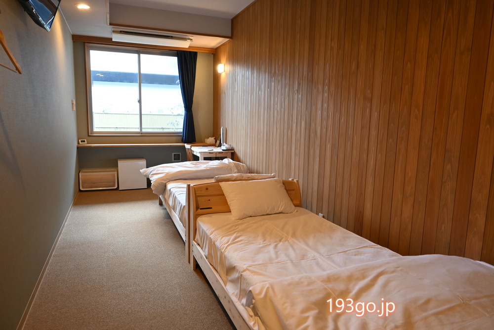 奥行きがある室内にシングルベッドが縦に並んだシンプルな造り。木の温もりあるお部屋。