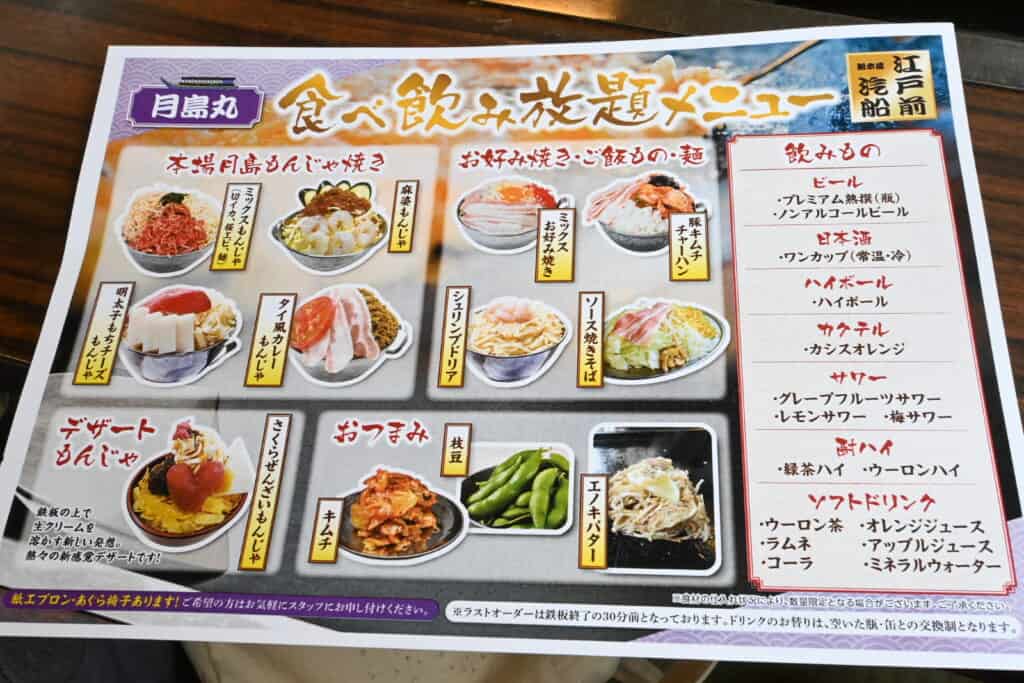 メニューは、月島もんじゃ焼きにお好み焼き、デザートもんじゃ、おつまみ、国産牛塊肉も!