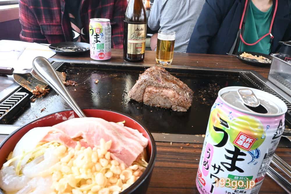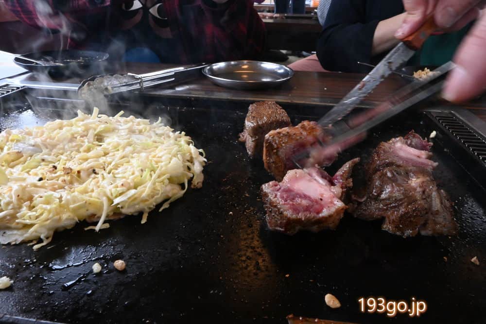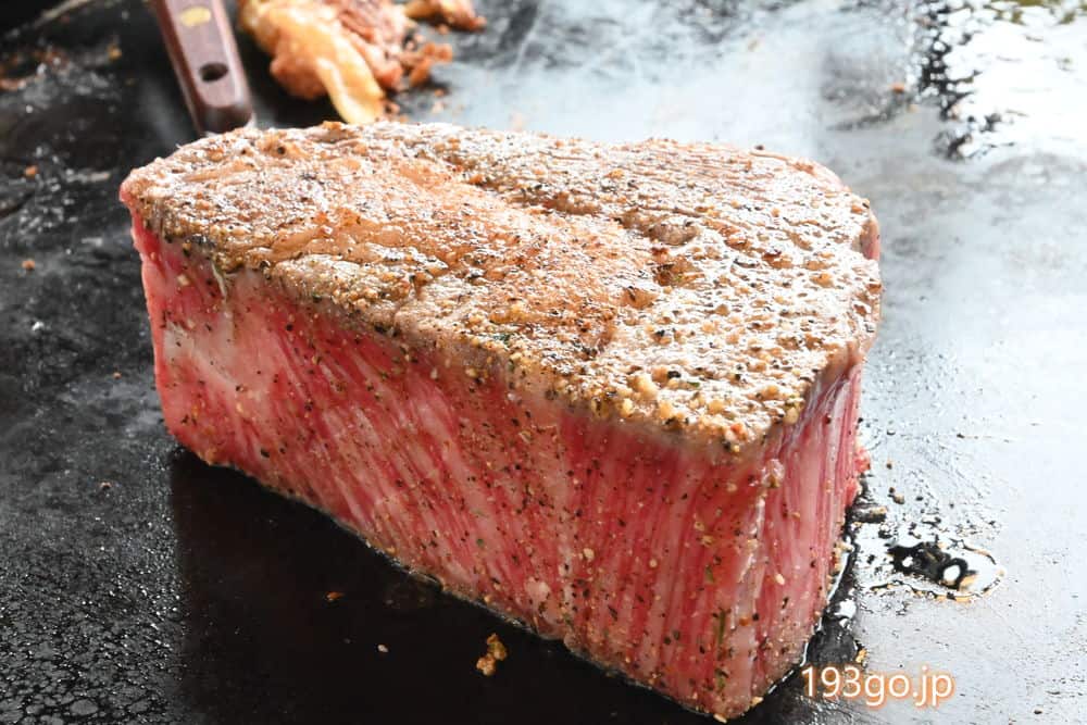 新木場精肉店卸の国産サーロインの塊肉が、ゴロンと鉄板に乗せられ、表面に焼き目を付けたら、食べやすい大きさにカット。旨み凝縮、激うまだった。