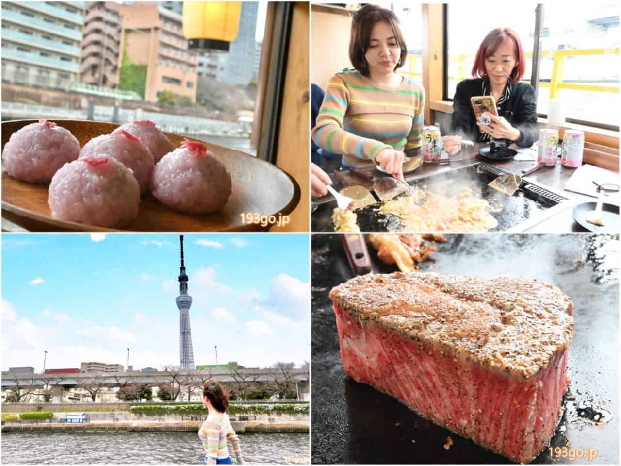勝どきから乗船、お花見周遊コース体験 もんじゃ焼き&お好み焼きが食べ放題!国産サーロインの鉄板焼きも