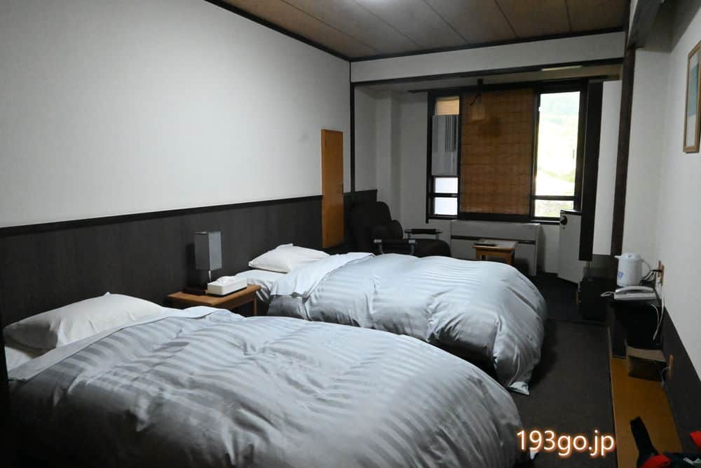 和風だけど布団ではなく、カーペットの上にベッドが2台置かれてる。