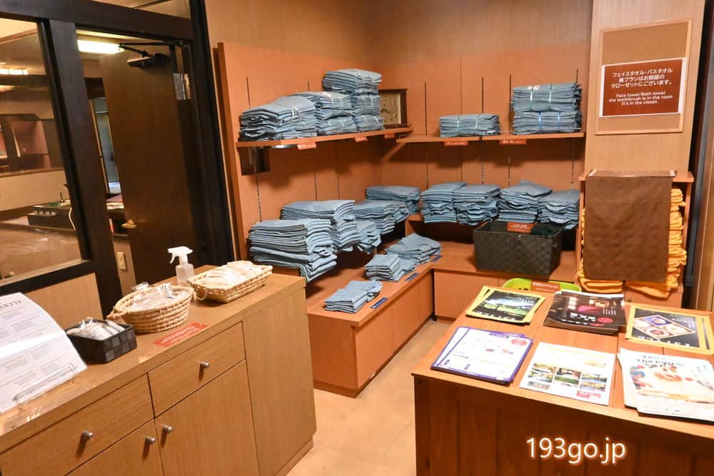 フロント脇に貸し出し用の浴衣やアメニティ類が置かれている。