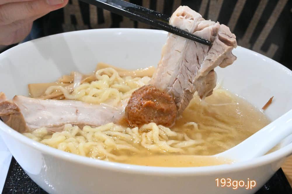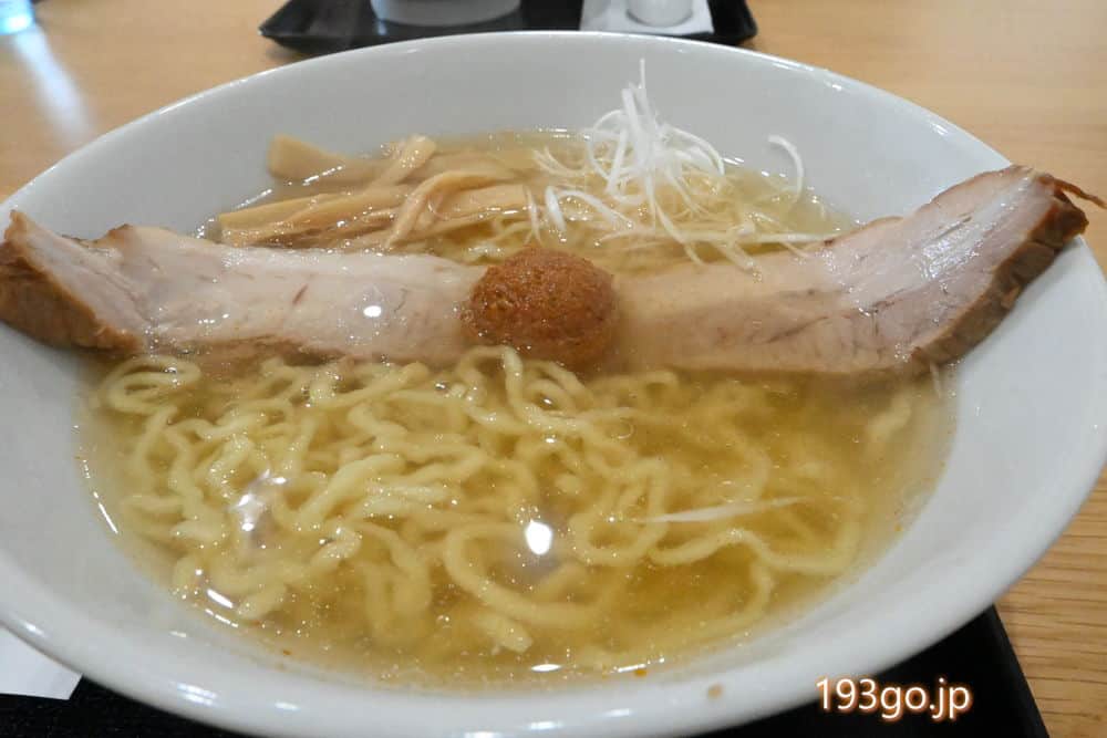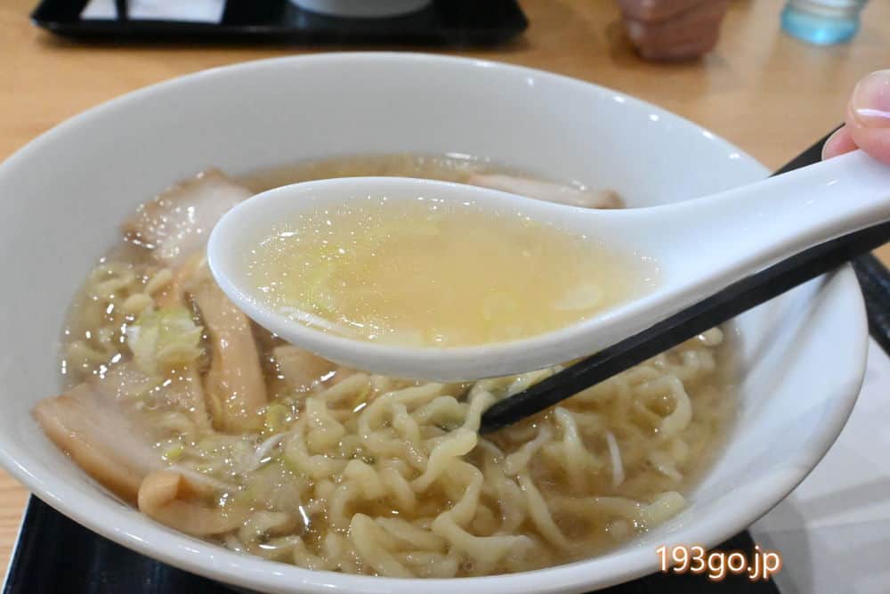 スープは透明感があり、あっさりした塩味ながらも奥深いコク旨さと甘みを感じる。