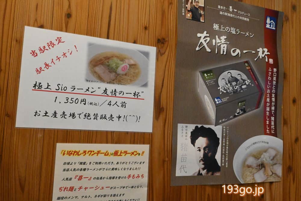 帰りに寄った、福島の「道の駅 猪苗代(いなわしろ)」のフードコートには「喜一」のラーメンが。お土産にも塩ラーメン4食入りが販売されていた。