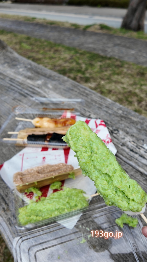 土手でたっぷりぬた団子とみたらし団子を頬張る