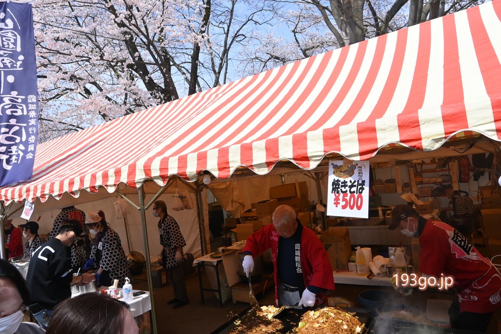 出店ではリーズナブルなグルメ販売、広場でシート広げてお花見している人たちも。