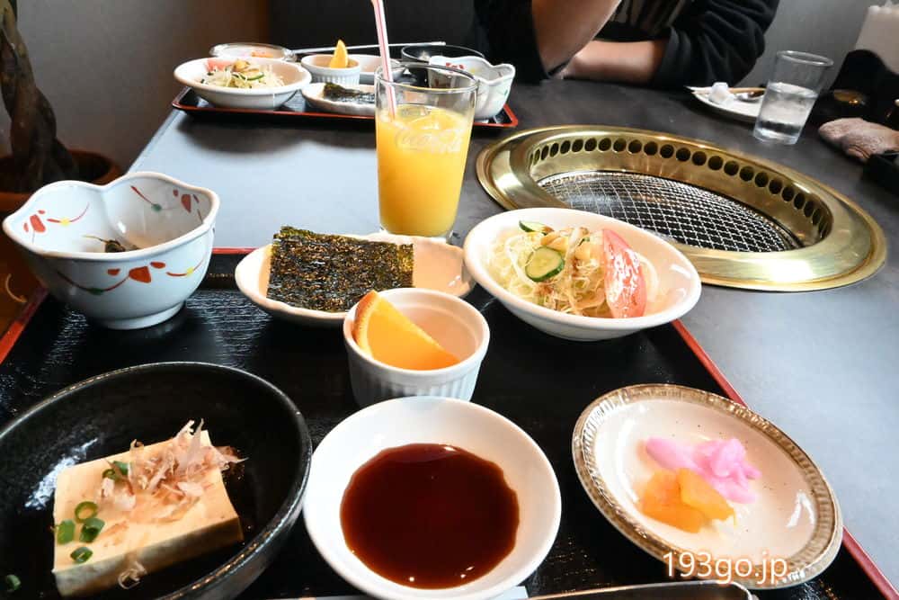 ランチセットは味噌汁、サラダ、お新香、小鉢、冷奴、韓国のり、フルーツ付き。