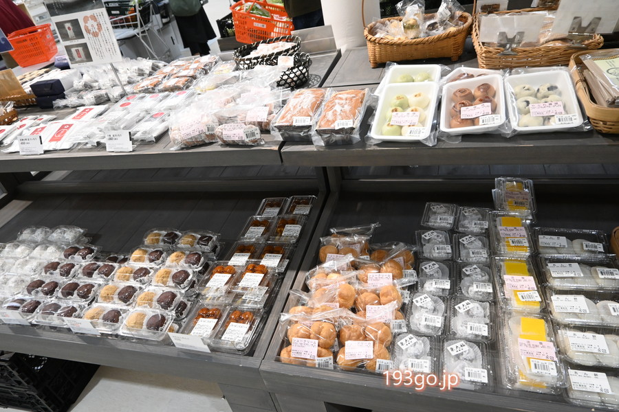 野菜・果物の他、味噌、豆腐、地酒、飲料、菓子土産、お団子やお惣菜がズラリ。
