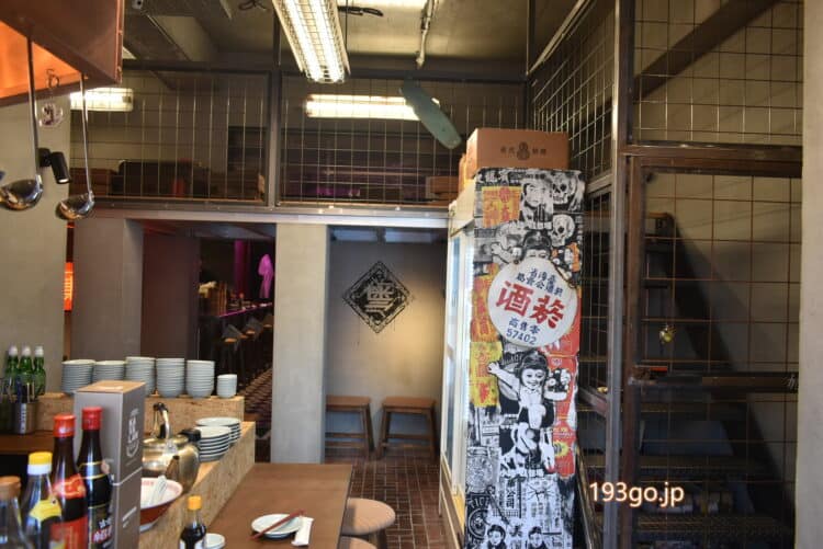 おたまがぶら下がる露店のおでんの様なカウンター席や、ネオンが点滅するテーブル席、温泉地のゲームセンターにありそうなゲーム台がテーブルになった一角、キッチンエリアに入っていくような感覚になる厨房風の席…ここがメインエリアかな、一番広々している。