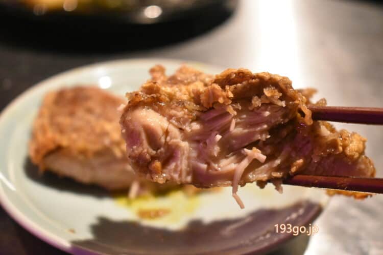 ナイフで食べやすい大きさにカットするとこれもまた肉ジュワな断面で、肉厚具合も驚き。衣はサクサクで肉質も柔らかく歯切れが良い!香粉の甘いスパイスの香りもしてジューシー。