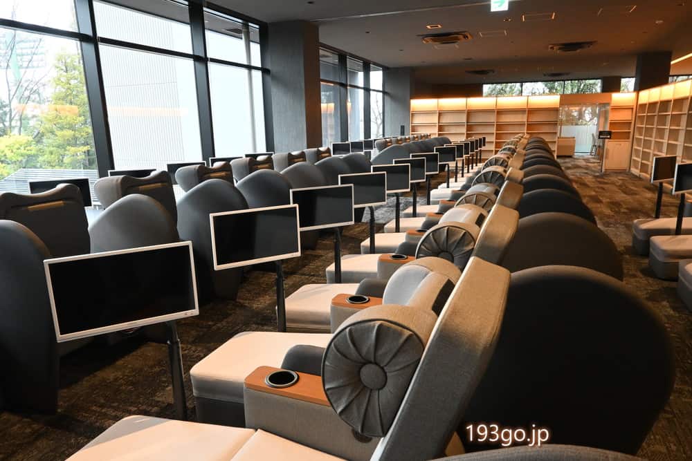 50台以上のテレビ付リクライニングチェアと10,000冊以上のコミックや書籍が置かれてる。