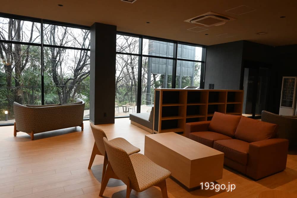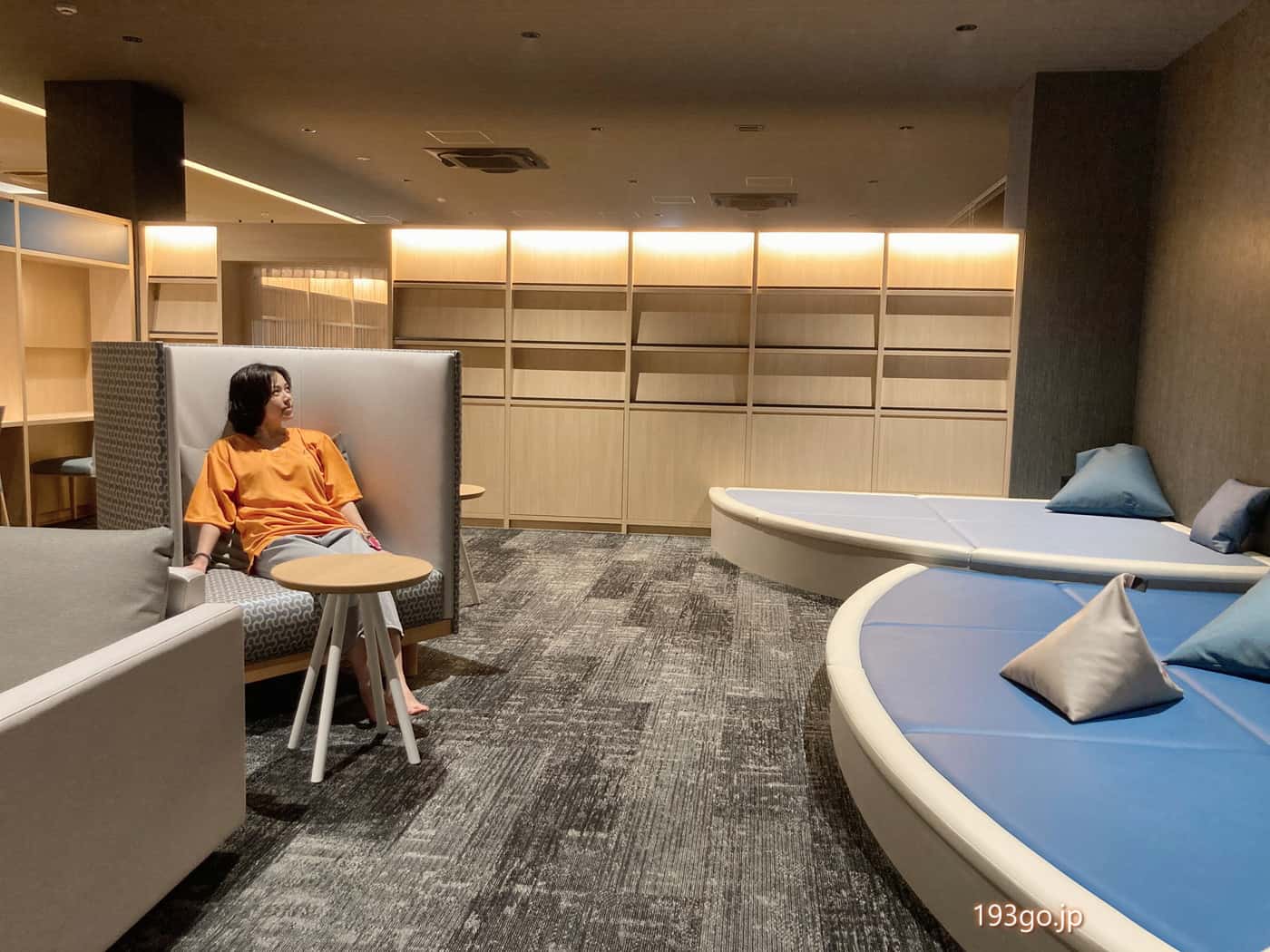 まず、入ったところの専用休憩ラウンジには、デザインの異なるゆったりしたソファやデスクもあり広々。