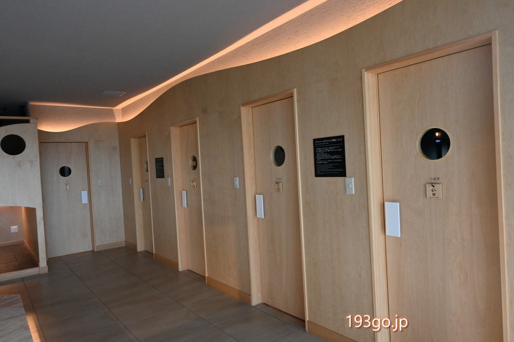 岩盤浴室への扉を開けると、火窯(プルガマ)の岩盤浴「火窯(ひがま)の間」、ミスト岩盤浴「花霞の間」、5つの個室サウナに、クールルーム「涼みの間」。