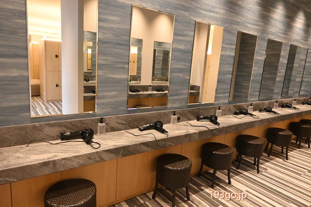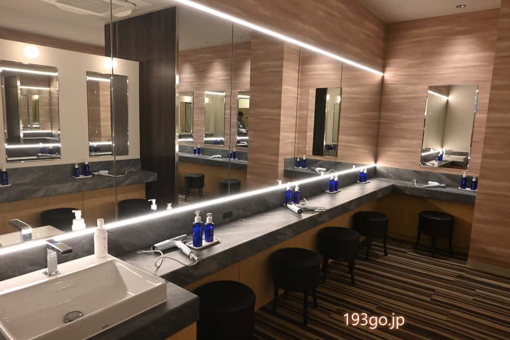 鍵付きのロッカー、パウダースペース(洗面台)にはReFa(リファ)のドライヤー、雪肌精のスキンケア用品がセット。