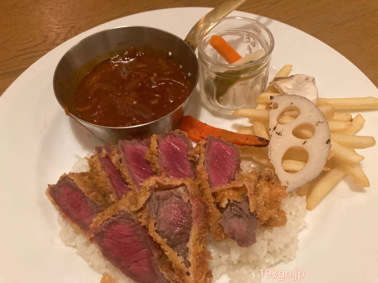 ライスの上に牛カツが乗っている。