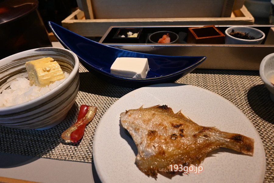 網の上で炙っていただく浜坂産・鰈(かれい)の一夜干しは、表面はパリパリと香ばしく身はふっくら。