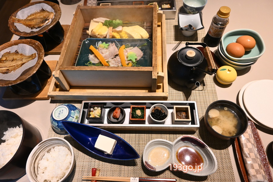 夏の特選グルメ会席(白イカ姿造り・アワビ・但馬牛・但馬鶏)プランで贅沢な夕食を堪能した翌朝、地元の食材をふんだんに使った朝ごはん。