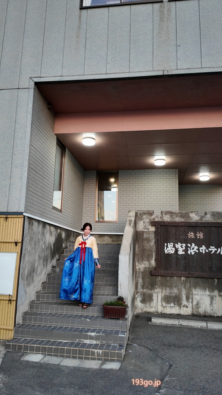 目の前に海が広がり、源泉かけ流しの熱々の温泉に浸かって、韓国衣装のコスプレ体験、