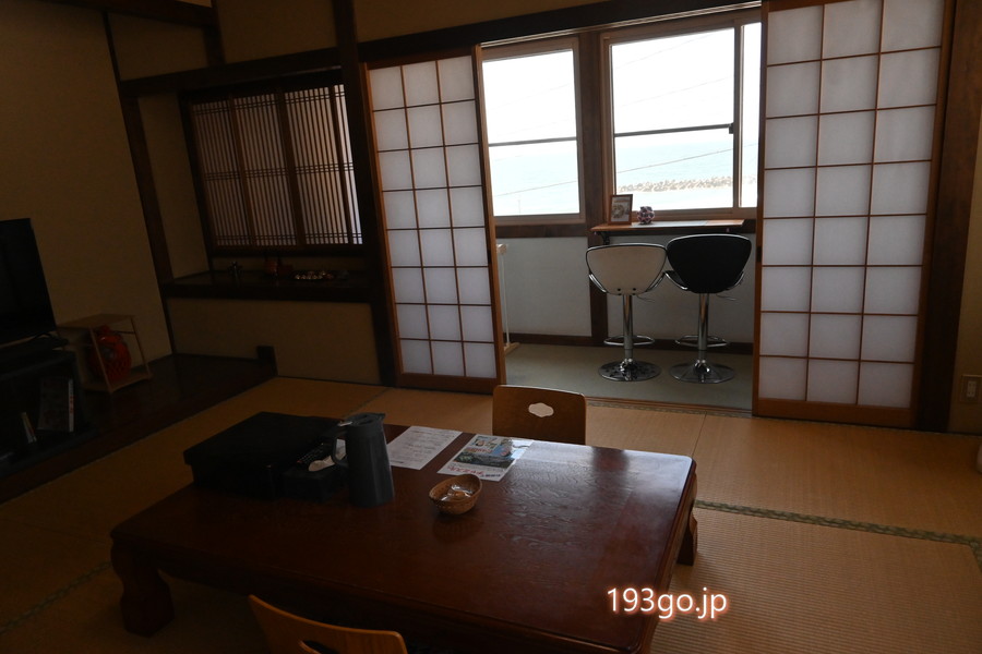 テレビ、クーラー、扇風機、テーブルと座椅子、目の前に海を見渡せるカウンター席。