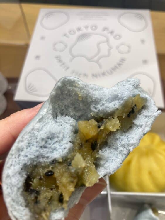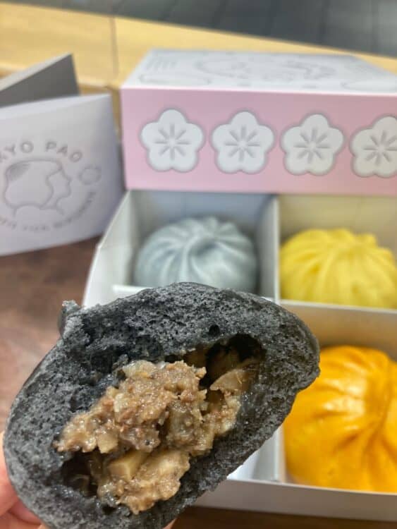 竹炭を加えた皮の中にピリリと花椒の効いた餡が詰まってる。