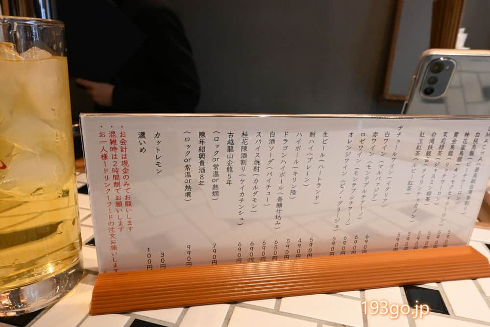 桂花蜜烏龍(キンモクセイウーロン) 、黄金烏龍(リッチウーロン)などのUMACHA(最高級台湾茶割り)も各種590円で揃う。お茶としてストレートでの注文も可能。