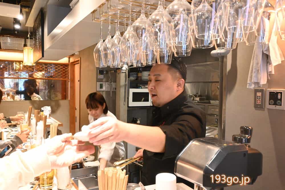 店内は、奥行きがあるミニマムな空間にカウンターとキッチン、奥には相席やグループで楽しめるテーブルを設けたオールスタンディング。