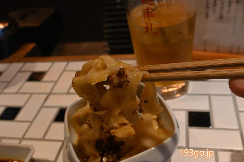 もちもちとした生の刀削麺に、ピーナッツバター、肉味噌、自家製辣油、花椒などの濃厚タレを絡めて(味変で自家製麻辣油、オレンジ酢も)